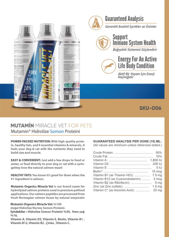 Mutamin Organics Miracle Vet is our brand name for hydrolyzed salmon proteins used in premium petfood applications. Our salmon peptides are processed from fresh Norwegian salmon tissue by natural enzymatic